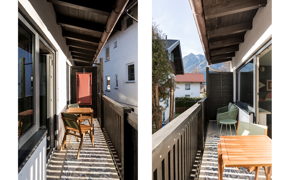 In unserer Maisonette Suite genießt Ihr vom Balkon den schönen Bergblick auf den Wank. Ihr schlaft in einem bequemen Bett auf der Galerie, Eure Gäste oder Kinder im separaten Schlafzimmer mit zwei Einzelbetten.  Die Suite ist mit einer kleinen Küche, gemütlichem Esstisch und einem Bad mit Dusche ausgestattet.