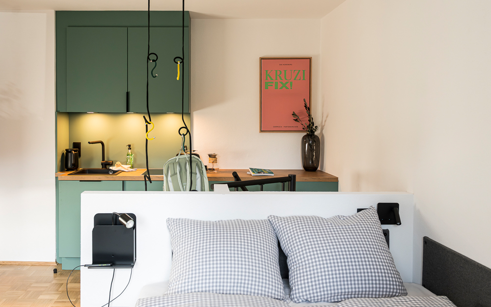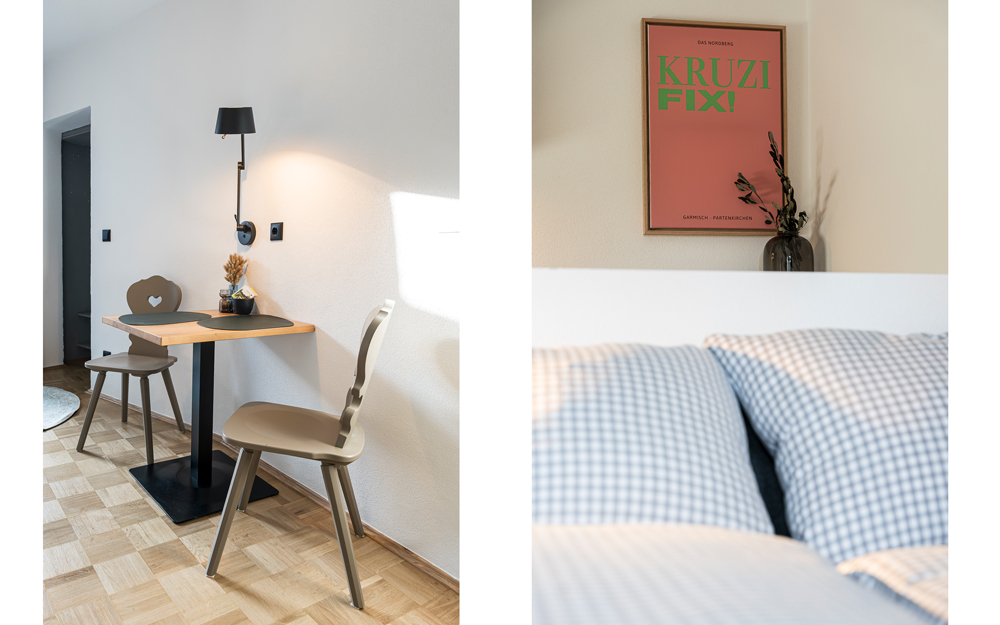 In unserem Familienzimmer genießt Ihr vom Balkon den direkten Bergblick auf den Wank. Ihr schlaft im geräumigen Hauptraum und Eure Kinder oder Gäste im Kinderzimmer mit kuscheligem Etagenbett. Das Zimmer ist mit einer kleinen Küche, gemütlicher Sitzecke und einem Bad mit Dusche ausgestattet.